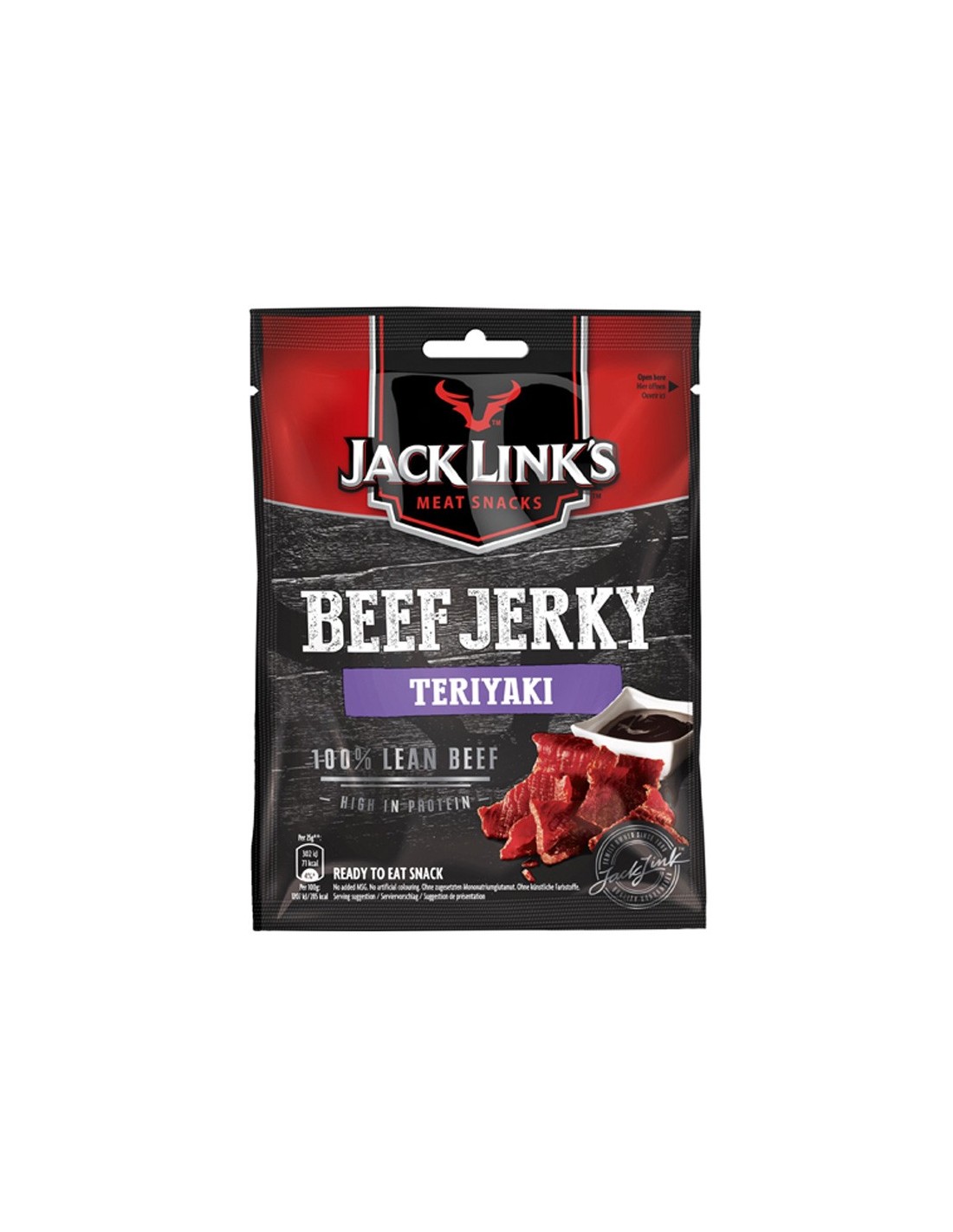 Snack de viande de spécialité à base de bœuf tranché, mariné, fumé et séché – saveur teriyaki. 100 % bœuf de première qualité, mariné dans une sauce soja épicée avec une touche de gingembre pour une note fruitée asiatique. Le sachet absorbant n'est pas comestible. À conserver de préférence au réfrigérateur.