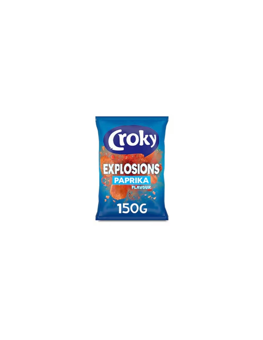 Croky Explosions Paprika (150g) zijn krokante, geribbelde aardappelchips met een intense, licht pittige en zoete paprikasmaak, die een 'explosieve' smaakbeleving beloven door een mix van kruiden, suiker en een zoetstof van natuurlijke oorsprong, ideaal als snack voor liefhebbers van hartige en kruidige smaken, vaak ook glutenvrij.