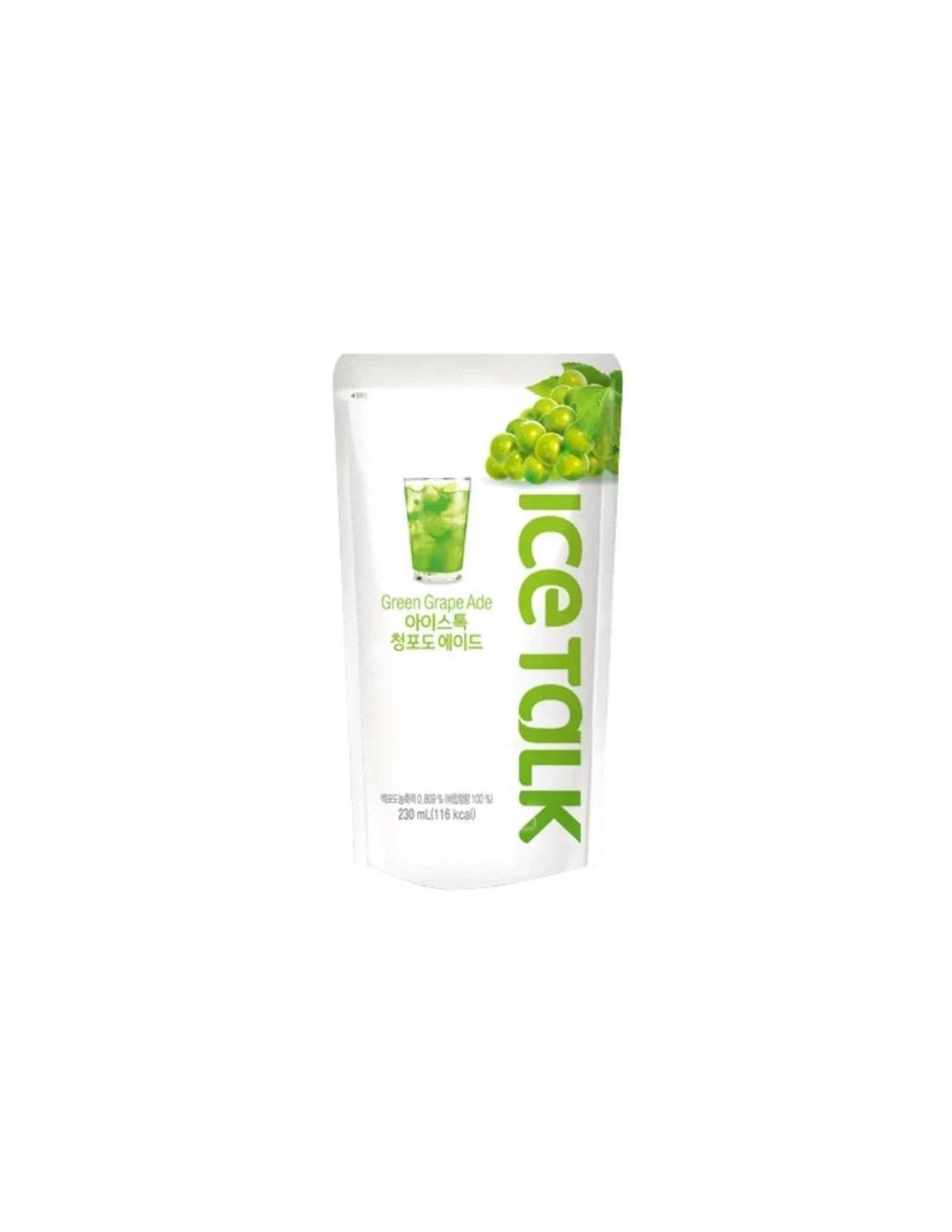 Ice Talk Green Grape Ade 230 ml is een verfrissend, bruisend Koreaans drankje met een zoete, sappige groene druivensmaak, ideaal voor warme dagen of als fruitig alternatief voor frisdrank. Het is een handige 230 ml verpakking (soms een pouch, Seoul Oasis) die ideaal is voor onderweg en gemaakt is met echte druiven. Het drankje is licht gezoet en kan gekoeld of met ijs geserveerd worden.