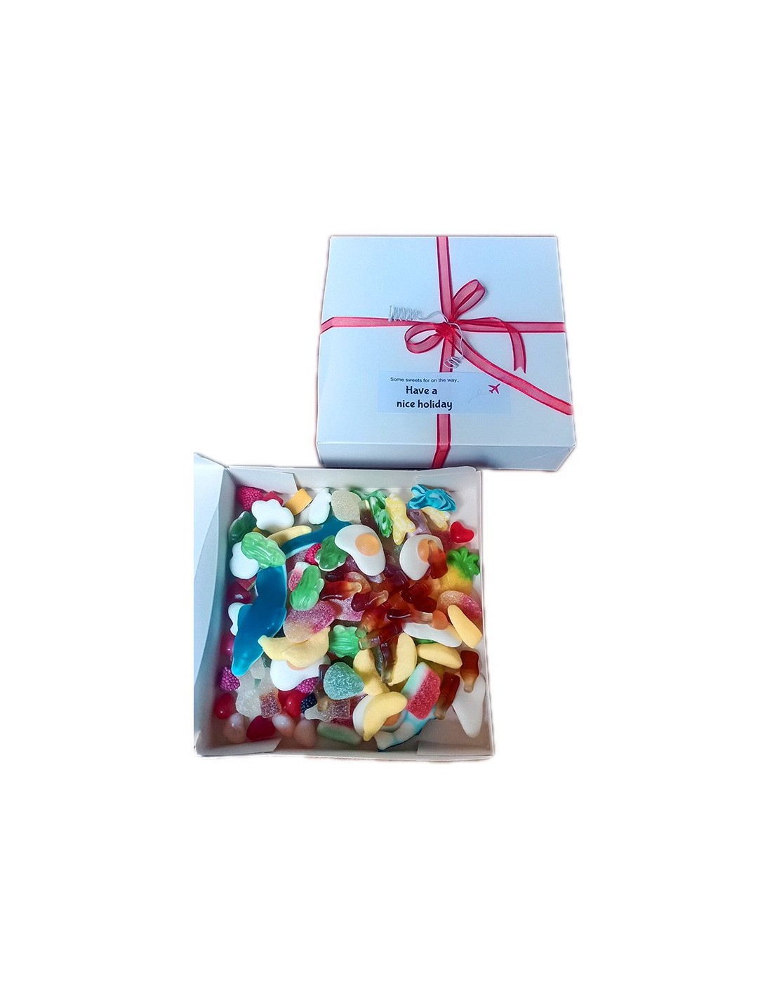 Ideale manier iemand een prettige vakantie te wensen, keuze uit verschillend snoep zuur, normaal of mix, ook kunnen we gepersonaliseerde sticker maken voor erop , noteer dit bij opmerking en dan doen we dit.