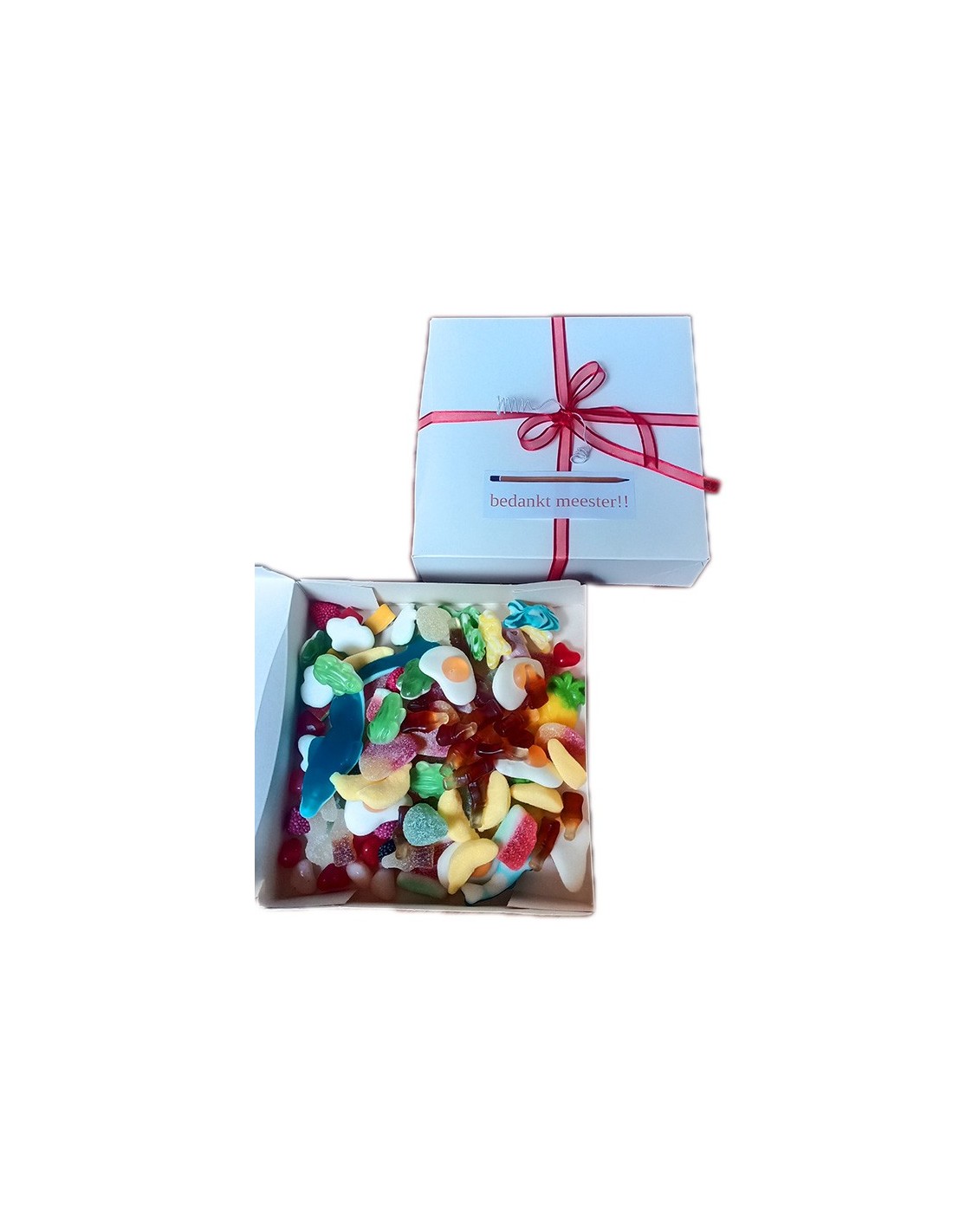 Ideale manier je meester te bedanken, keuze uit verschillend snoep zuur, normaal of mix, ook kunnen we gepersonaliseerde sticker maken voor erop , noteer dit bij opmerking en dan doen we dit.