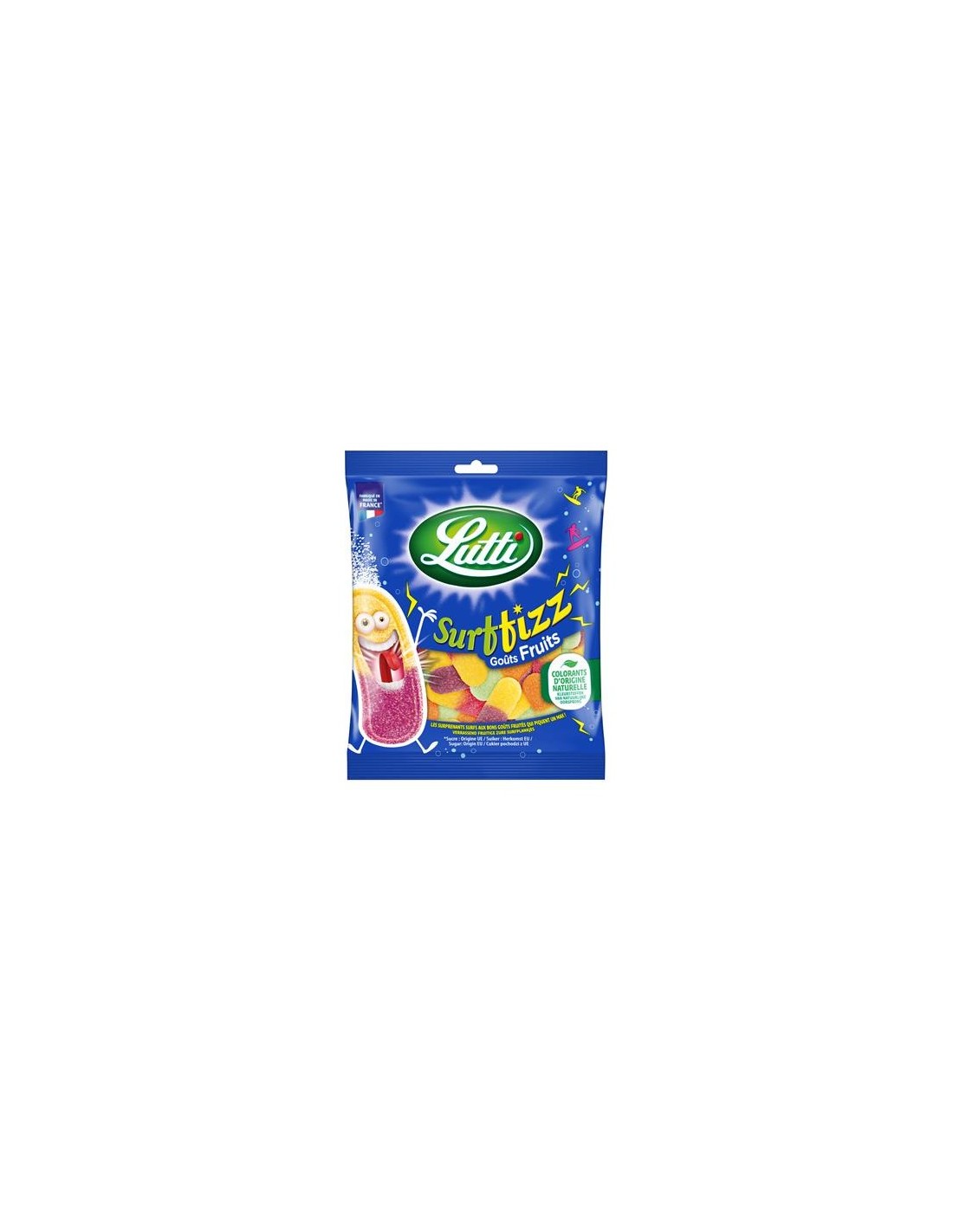 Lutti Surffizz Fruits 100g zijn pittige, taaie, surfplankvormige gummisnoepjes met intense fruitsmaken zoals appel-sinaasappel, framboos-citroen en zwarte bes-citroen. Ze zijn omhuld met zure suiker voor een prikkelend gevoel en bieden een leuke, bruisende traktatie, gemaakt in Frankrijk met eenvoudige ingrediënten en een glutenvrije formule.