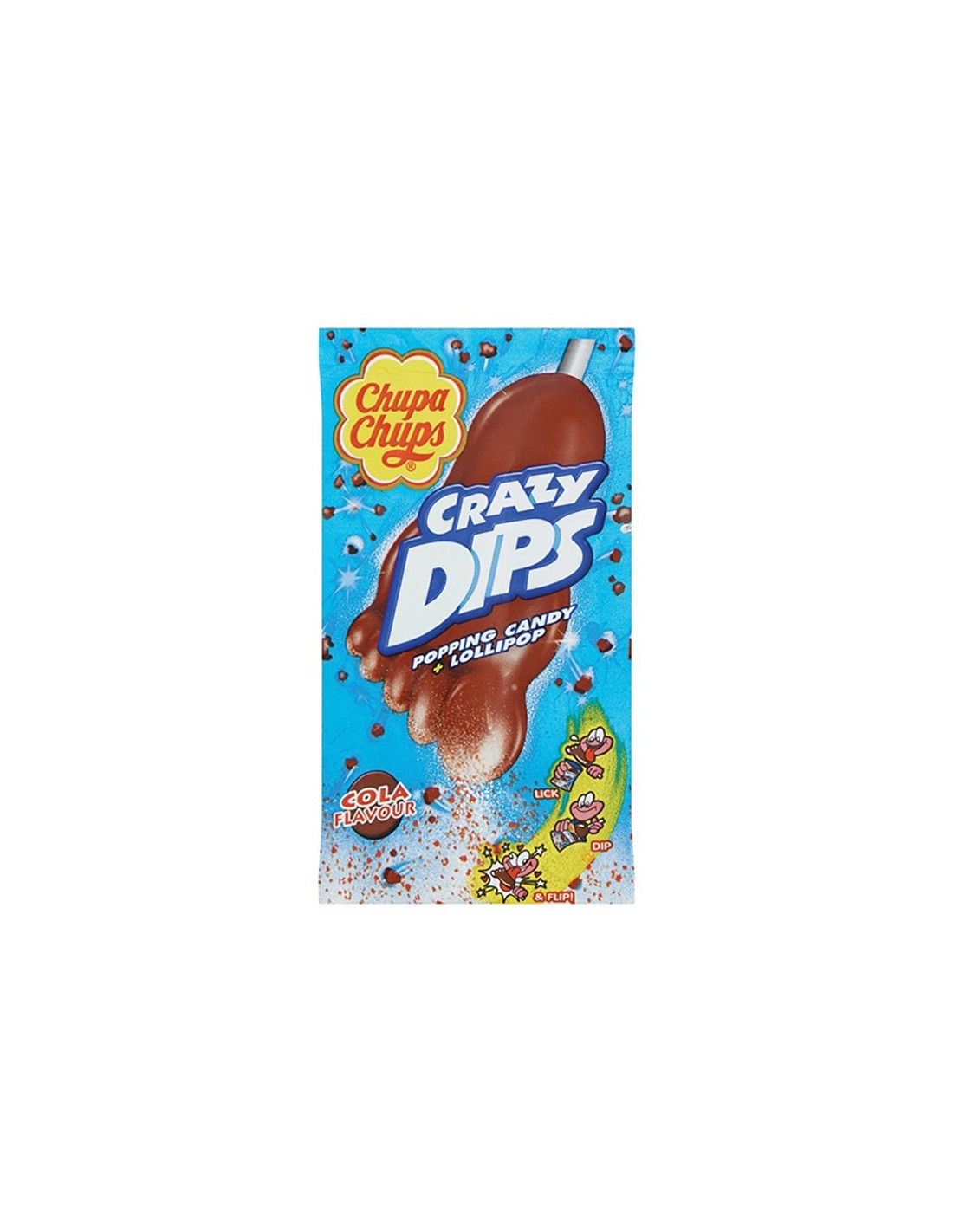 Chupa Chups Crazy Dips Cola Smaak terug naar de kindertijd met de beroemde Chupa Chups Crazy Dips Cola-lolly. Een heerlijke lolly in de vorm van een voet om te weken in het knetterende poeder in de mond. Lolly met knetterende poeder voor een verrassende smaak!