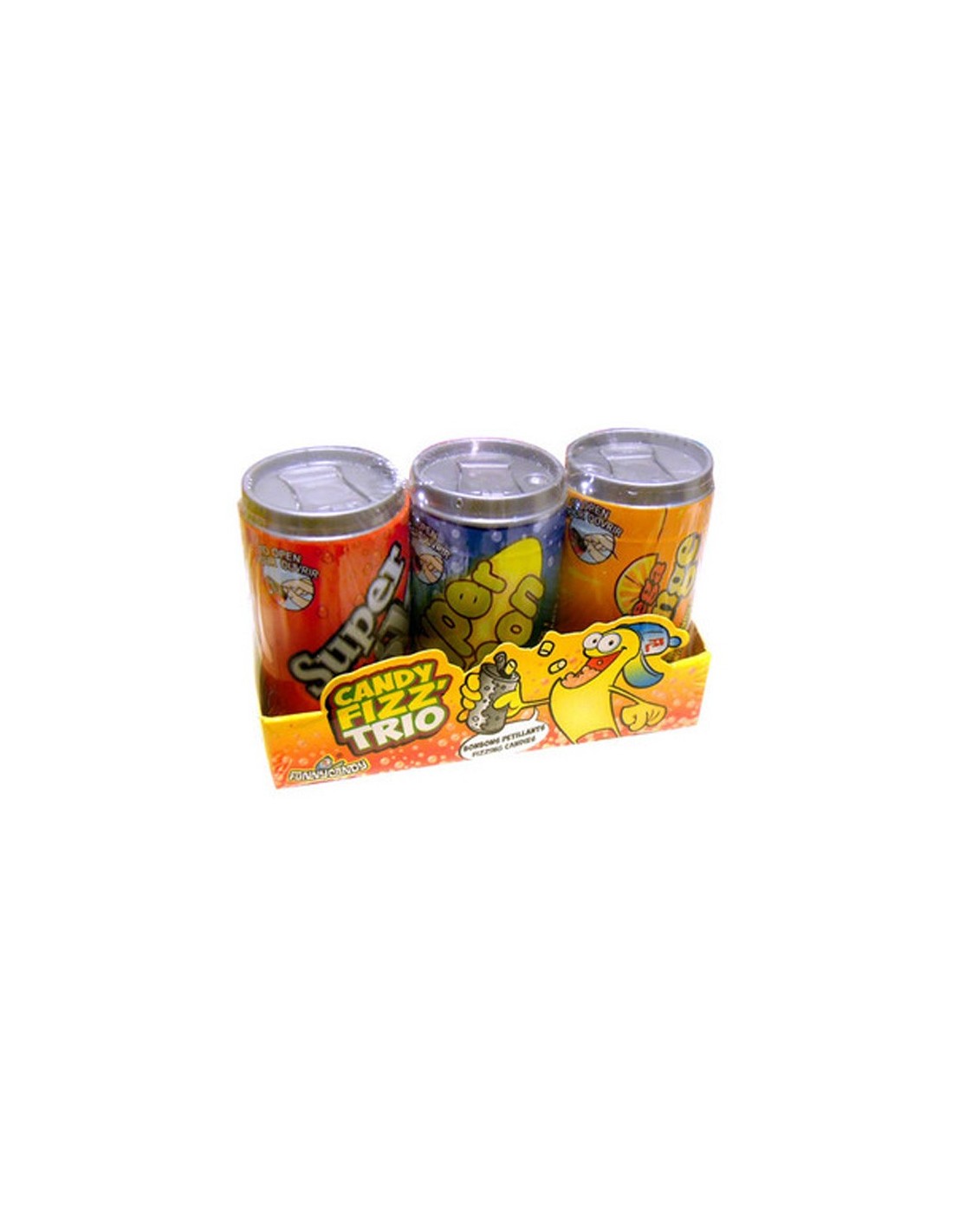 De 3 Candy Fizz Trio mini blikjes cola, citroen en sinaasappel gevuld met sprankelende snoepjes met natuurlijke kleurstoffen.