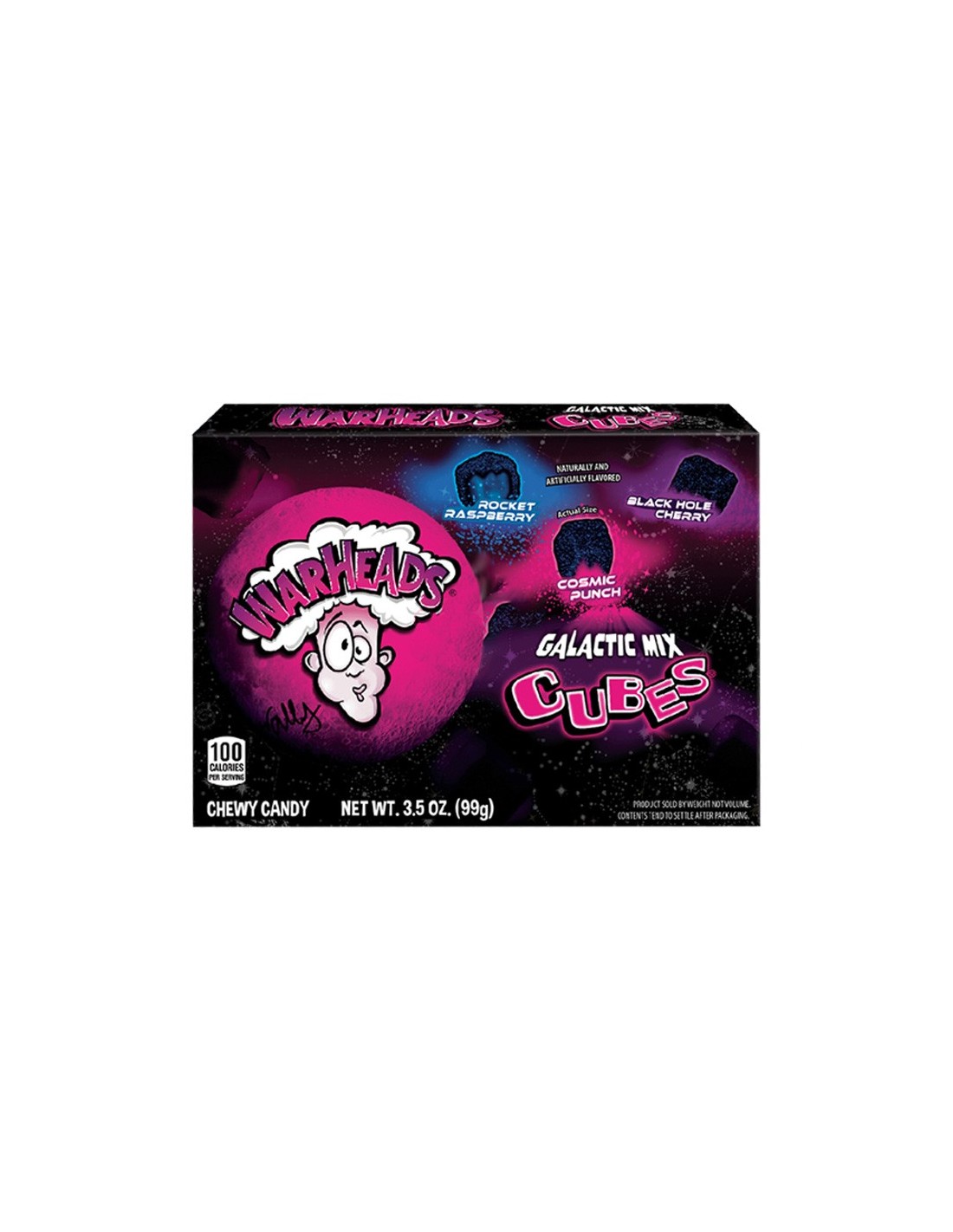 Warheads Galatic Cubes zijn gewoon niet van deze wereld! Deze gloednieuwe versie van de immens populaire Warheads-kubussen zien er aan de buitenkant misschien hetzelfde uit, maar van binnen krijg je misschien wel een van de 3 intens fruitige smaken; Black Hole Cherry, Cosmic Punch of Rocket Raspberry. Elke zak bevat ongeveer 40 gummy blokjes van een halve inch.