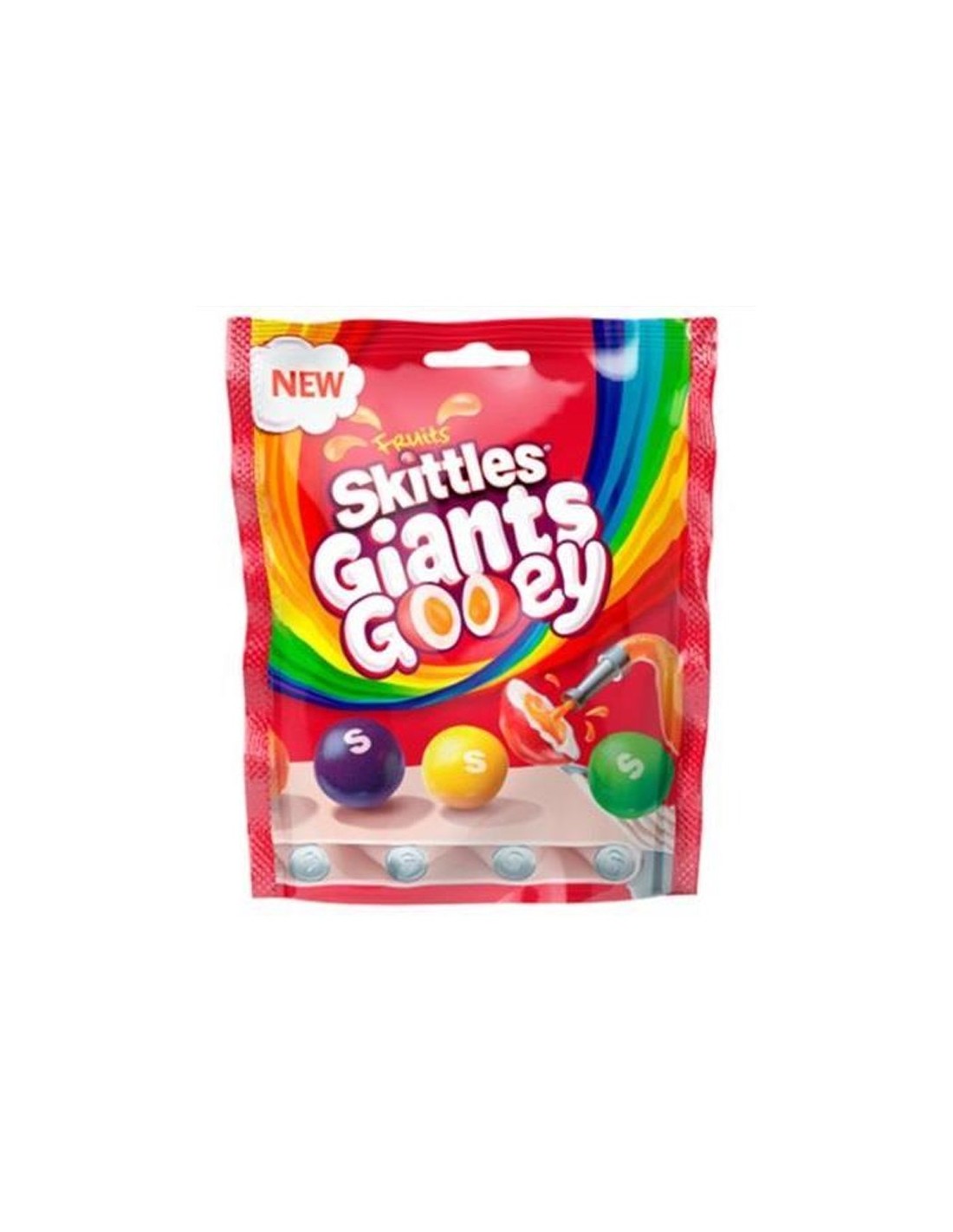 Skittles Gooey Giants zijn veganistisch en verkrijgbaar in vijf fruitsmaken: aardbei, limoen, citroen, zwarte bes en sinaasappel.