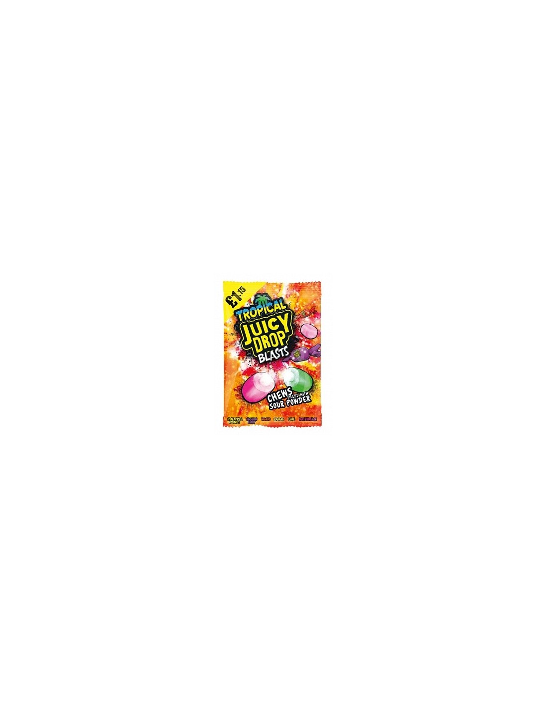 Bazooka Juicy Drop Blast Tropical Chews gevuld met zuur poeder zijn een heerlijke snoepervaring die een chewy textuur combineert met een explosie van tropische smaken. Elk stukje heeft een zachte, chewy buitenkant met een pittige zure poederkern, waardoor je de intensiteit van de smaak kunt aanpassen.