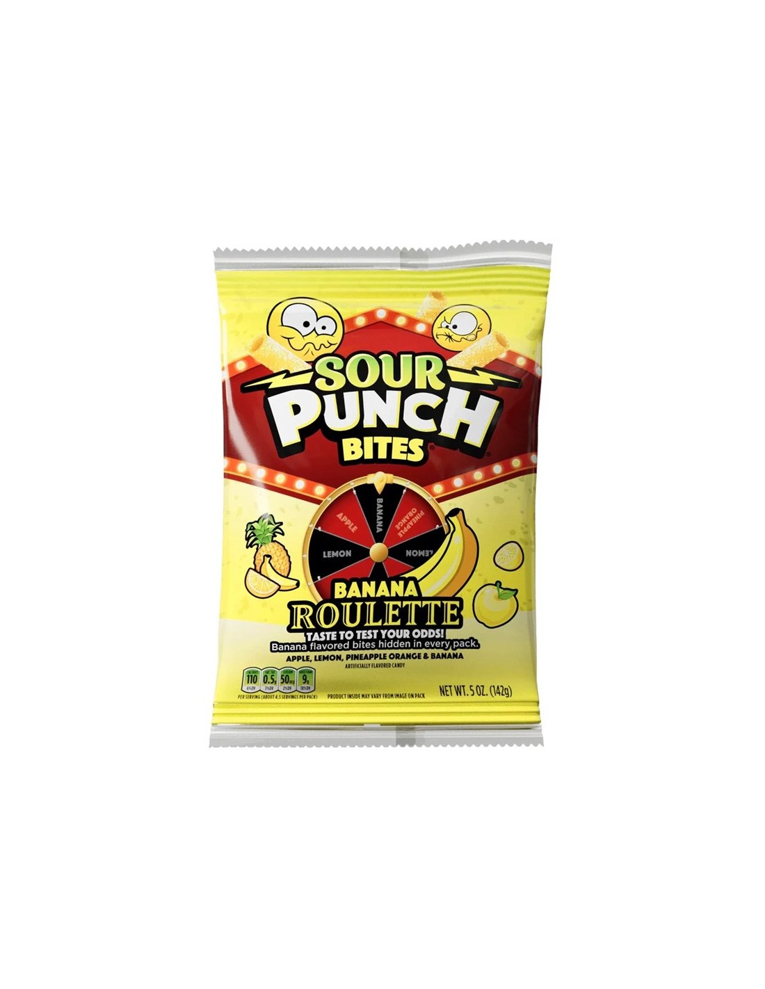 Sour Punch Bites Banana Roulette bevat fruitige, zure snoepjes met een verrassende bananensmaak. Het is chewy, pittig en perfect voor leuke tussendoortjes of snoepuitdagingen. Maak je klaar voor een fruitige twist met Sour Punch Bites Banana Roulette!